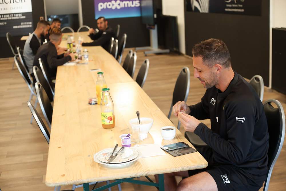 Un à un, ses équipiers le rejoignent. Yaourts, confitures, café, jambon, fromage, fruits, avocats... Le choix est varié et chacun a ses habitudes. Nadine, la "maman" des joueurs, leur prépare aussi des omelettes. "C'est deux oeufs, hein, toi?", lance-t-elle à Gaëtan Hendrickx, qui lui répond d'un pouce levé.