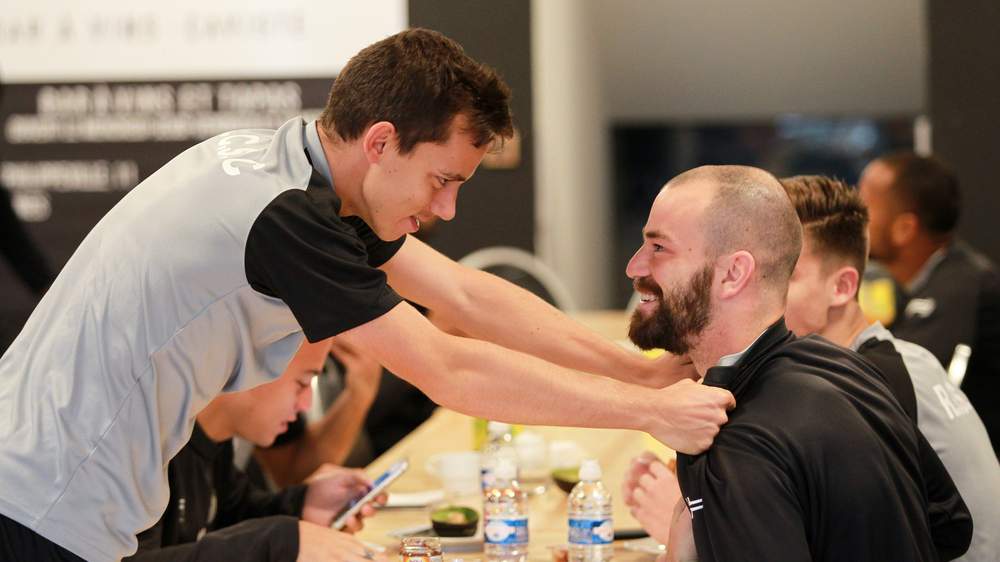 A la table à côté, le staff termine lui aussi de manger. "Comme tous les matins, je mange deux yaourts", se marre Felice Mazzù. "Non, en fait, d'habitude, c'est plutôt rillettes et deux tartines. Mais comme vous êtes là, je fais un effort." Philippe Simonin (préparateur physique), Mario Notaro (T2) et Michel Iannacone (entraîneur des gardiens) explosent de rire.