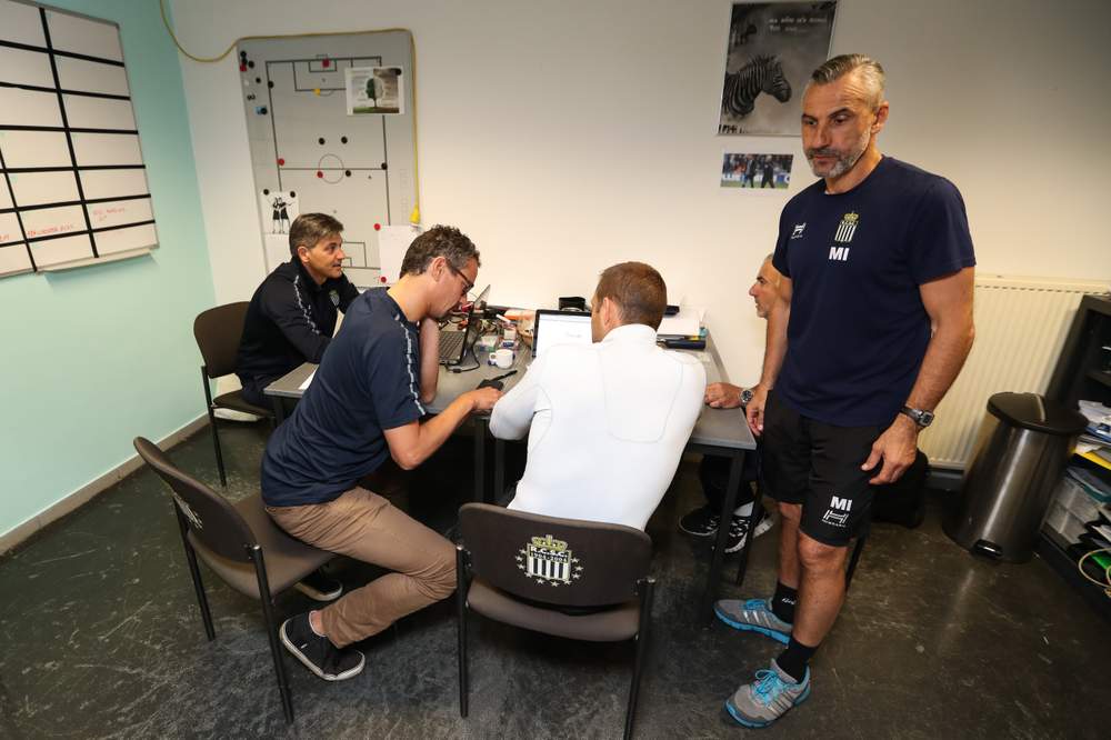 A côté du vestiaire, le staff est réuni, dans son local, où il prépare l'entraînement du jour. Philippe Simonin prendra en charge l'échauffement, Mario Notaro les premiers exercices et Felice Mazzù terminera par une séance un peu plus tactique. Rien n'est laissé au hasard.