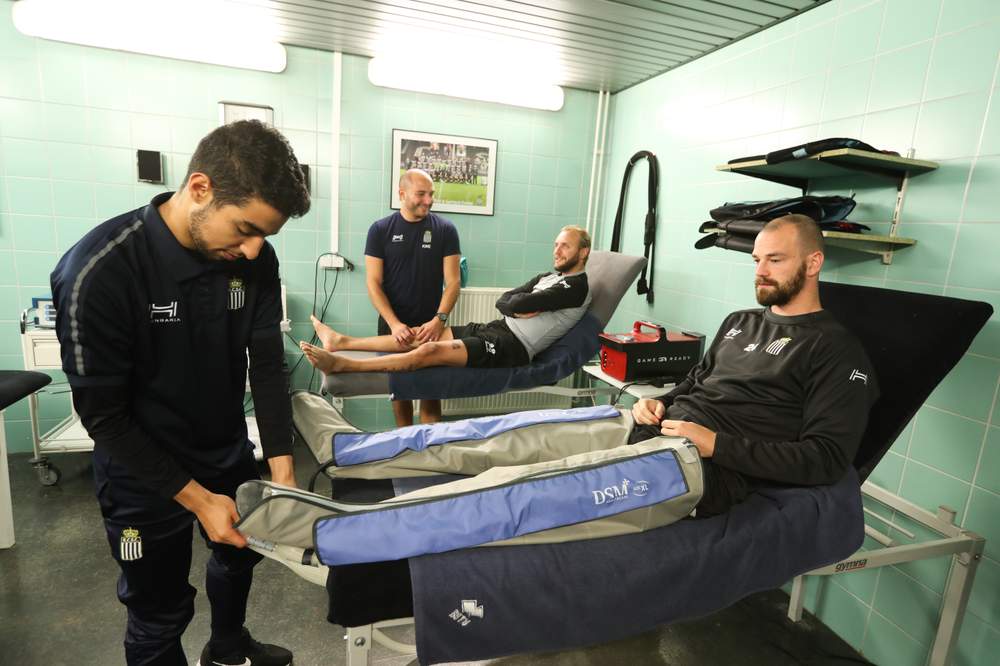 Avant l'entraînement, les joueurs qui souffrent de petites (ou grosses...) blessures passent chez le docteur Borlée puis entre les mains des kinés.