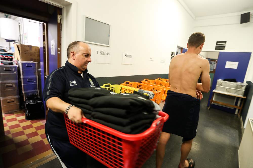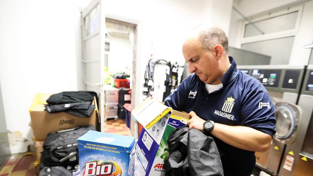 Dès le retour de l'entraînement, les joueurs carolos se précipitent vers Bello pour lui donner leurs vêtements (trempés). David Dal Mut, de son vrai nom, le magasinier du club, ne perd pas de temps et enchaîne les premières machines. "Honnêtement, je suis incapable de vous dire combien j'en fais par jour...", explique celui qui travaille au Sporting depuis plus de quinze ans et qui se lève à 5h30 tous les jours pour être au Mambourg à l'arrivée des joueurs.