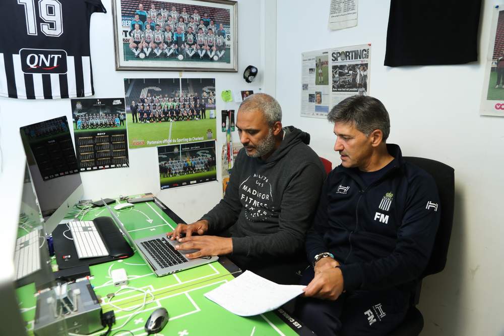 L'entraînement est terminé mais le coach, lui, est toujours à l'ouvrage. Aux côtés de Wahib Neghli, le technicien vidéo du club, il découpe les images du dernier match. Le but : préparer la séance vidéo et montrer aux joueurs ce qu'ils ont bien fait mais surtout ce qu'ils ont mal fait.