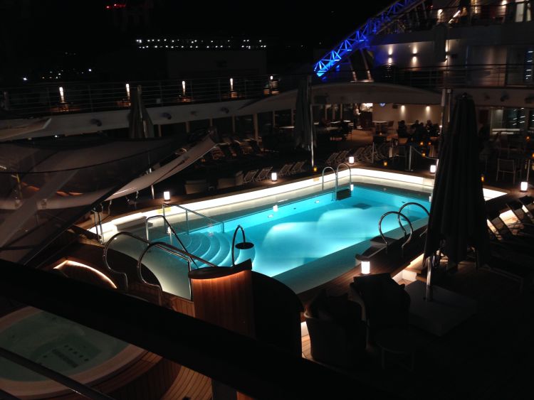 Plantons d’emblée le décor. Les vaisseaux de la flotte Seabourn sont connus pour combiner équipement, service et très grand luxe. Nous toisant de haut, l’énorme Ovation ne fait pas exception à